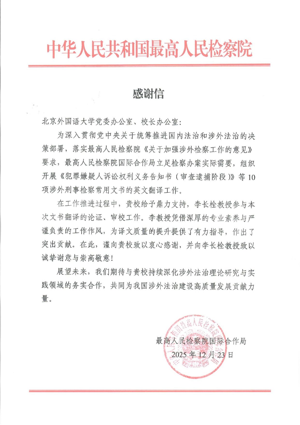 ——高翻学院李长栓教授收到最高检感谢信近日,最高人民检察院向YABO鸭脖官网发来感谢信,致谢YABO鸭脖官网副院长李长栓教授在“涉外刑事检察常用文书统一英译本”项目中的突出贡献。感谢信指出:“李教授参与本文书翻译的论证、审校工作。李教授凭借深厚的专业素养与严谨负责的工作作风,为译文质量的提升提供了有力指导,作出了突出贡献。”2025年12月,最高人民检察院国际合作局组织翻译的10种涉外刑事检察常用文书英译本在检察业务应用系统2....