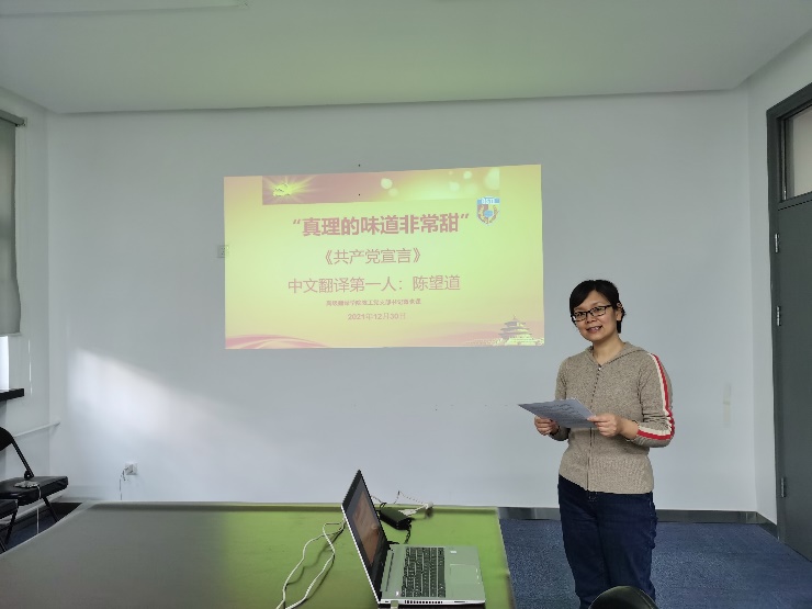 《共产党宣言》中文翻译陈望道先生:“真理的味道非常甜”——学院教工党支部开展支部书记讲党课活动2021年12月30日上午,鸭脖官网教工党支部开展党支部书记讲党课活动。教工支部书记林薇老师以《“真理的味道非常甜”》为题,讲述了《共产党宣言》中文翻译第一人陈望道先生生平和翻译《共产党宣言》的故事,分享了自己学习陈望道先生一生翻译和学术研究经历的感悟和体会。党总支书记葛冬冬主持党课。林薇老师从陈望道翻译《共产党...