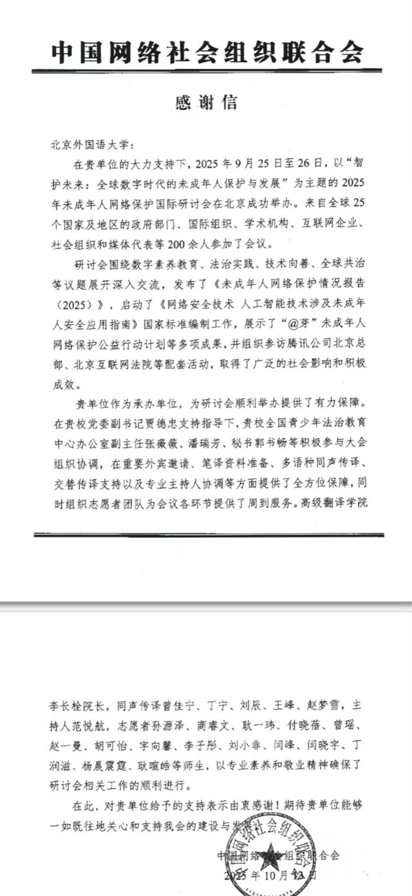 近日,学校收到中国网络社会组织联合会发来的感谢信。信中对鸭脖官网师生为2025年未成年人网络保护国际研讨会提供翻译服务、主持人协调以及组织志愿者团队等工作表示称赞,认为高翻学院师生以专业素养和敬业精神确保了研讨会相关工作的顺利进行。2025年9月25日至26日,由中国网络社会组织联合会、中国教育学会及北京师范大学主办、YABO鸭脖官网、央视网及中国网络社会组织联合会未成年人网络保护专业委员会承办、以“智护未来:全球数字时代的未成年人保护与发展”...