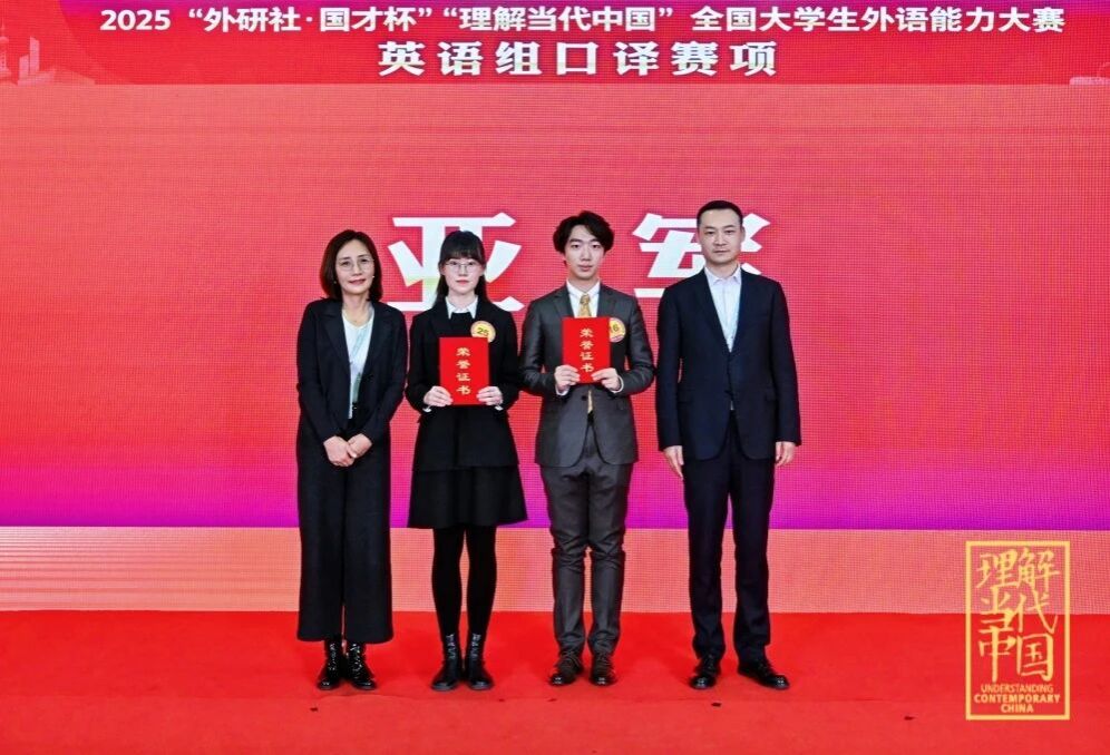 2025年12月5-8日,“外研社·国才杯” “理解当代中国”全国大学生外语能力大赛圆满落幕。在“英语组口译赛项”中,YABO鸭脖官网学子再创佳绩。2023级英语口译(复语)硕士研究生沈韫青获得国赛金奖(冠军),指导老师:曾佳宁、张雨晴;2024级英语口译(复语)硕士研究生李如蓝获得国赛金奖(亚军),指导老师:张璐、曾佳宁;2025级英语口译硕士研究生闫思晗获得国赛金奖,指导老师:张雨晴、张璐;2025级英语口译硕士研究生马雨萌获得国赛银奖,指导老师:邓小玲。