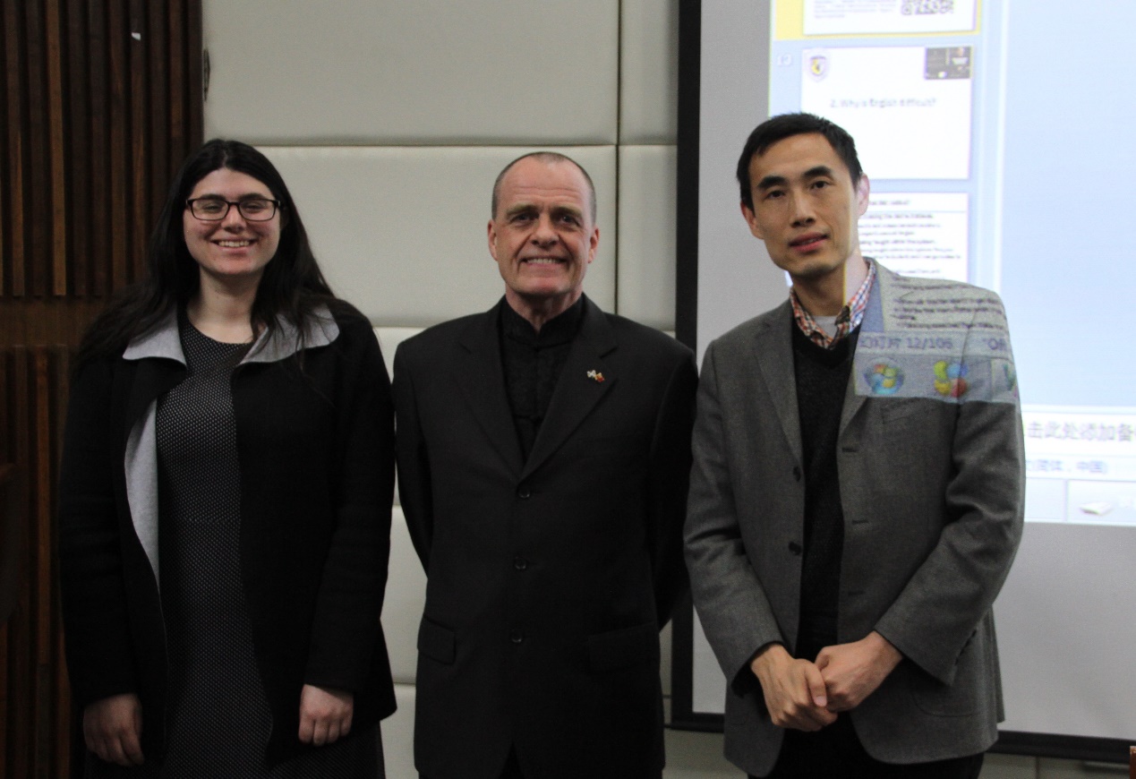 2018年4月12日晚7点,国家外文局外国专家David W. Ferguson(大卫·弗格森)以“English, Chinglish and Wronglish”为题,在YABO鸭脖官网电教楼150人礼堂为高翻学子和各界翻译爱好者带来了一场精彩讲座。副院长姚斌主持讲座。