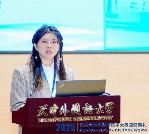 在这场高水平赛事中,鸭脖官网2025级中英会议口译专业7班肖薇同学表现出色,荣获译后编辑赛道全国一等奖,并作为获奖代表在颁奖典礼上发言,展现了鸭脖官网学子卓越的专业素养与技术应用能力。在发言中,肖薇分享了对人机协同翻译模式的体会。她表示,现代译者需兼具语言艺术家的细腻与技术专家的敏锐,不仅要打磨文字,也需善用工具。她认为,保持终身学习的能力、培养“语言+专业+技术”的复合素养,是应对技术革新的关键。