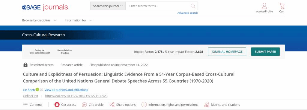 近年来,YABO鸭脖官网高度重视研究生独立思考和科研能力的培养,并取得显著成效。近日,2021级翻译学硕士研究生沈琳在国际SSCI二区期刊Cross-Cultural Research发表学术论文,题为Culture and Explicitness of Persuasion: Linguistic Evidence From a 51-Year Corpus-Based Cross-Cultural Comparison of the United Nations General Debate Speeches Across 55 Countries (1970-2020),系鸭脖官网学生首次在SSCI期刊独立发表论文,标志着高翻学院学术型研究生教育教学水平及人才培养质量迈上新台阶。