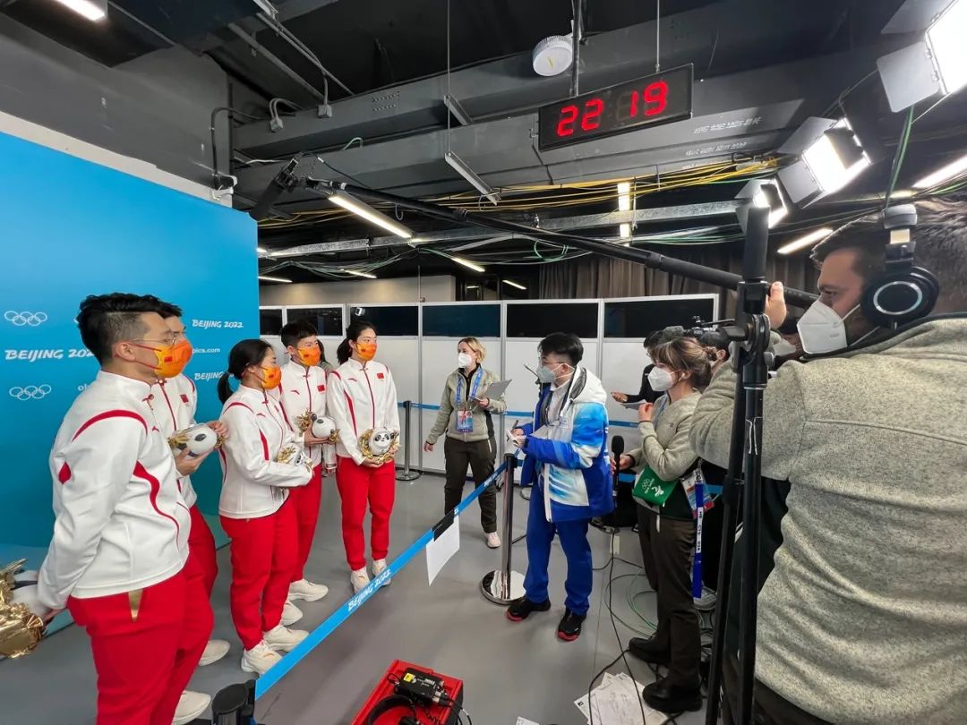 在首体的工作期间,前后提供了一些大大小小的翻译服务。其中最让人难忘的是为OBS采访中国短道速滑国家队夺得首金提供交传服务。在这之前,央视首先对他们进行了采访,我在极近的距离里,亲眼看到了范可新的数次哽咽,武大靖的掩面落泪,任子威的单纯快乐……那一刻,运动员的喜怒哀乐拥有着极强的感染力,在场的中国工作人员们无不动容,NBC的主持人也直言,“这是能够预料的赛后反应,”那样的一块金牌,对他们,对中国短道速滑,对整个冬奥会的意义都是非凡的,而我何其有幸能够近距离见证这一幕,我无比感谢自己曾经做出要参加冬奥会志愿工作的决定。