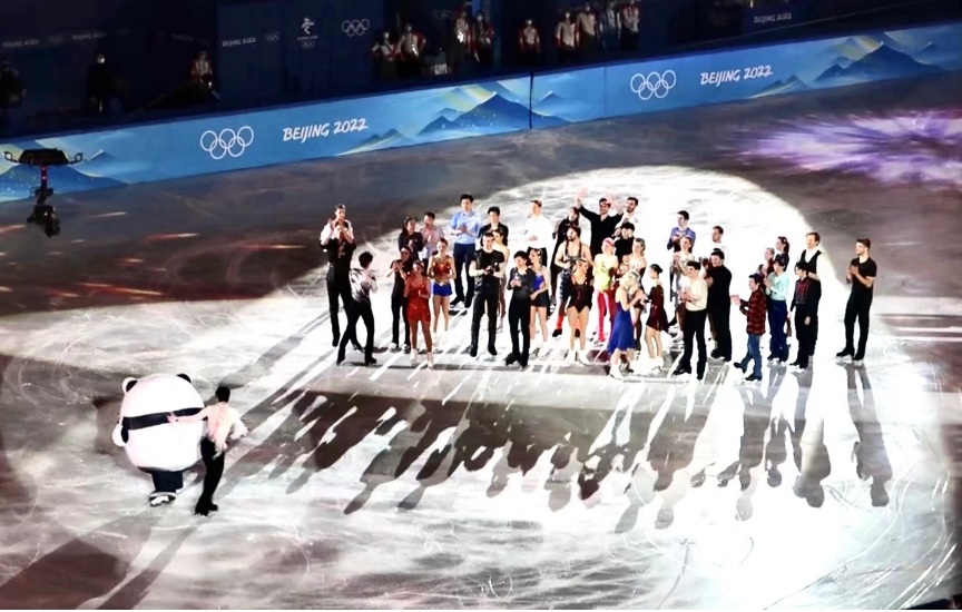 冬奥闭幕当天,也是花滑表演滑的日子。数十年如一日在清冷冰场上训练的运动员来到聚光灯下,来到她/他们的主场。我们坐在远处的观众席,掩身没入黑暗中,不再近距离地直面运动员,也无需争分夺秒给选手讲解颁奖流程,仅仅是投以注视,尽情献上掌声与欢呼。是,差点没把嗓子嚎哑。作为志愿者,在这片冰场上有幸见证了无数次超越与冲刺,也目睹了欢笑和泪水,但在这天,在表演滑运动员返场后,在天下一家亲的氛围里,我感受到了人类共通的情感和热爱。这不分国界,无关语言,它比所有掌声和欢呼都响亮。