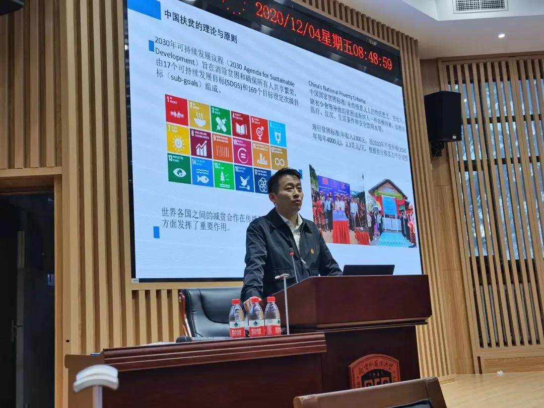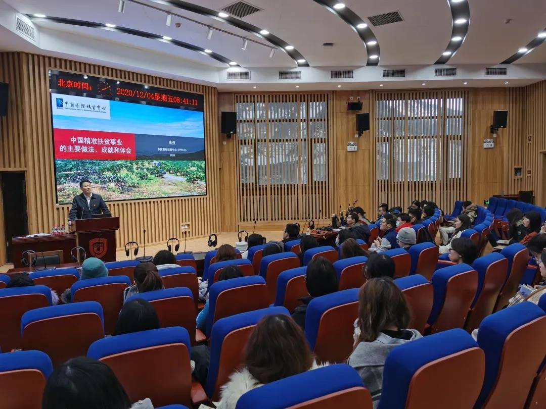 曲强老师以中国国际扶贫中心工作人员身份,自2009年开始参与扶贫工作,期间去过34个省和300个地级市,1000多个县和3000多个乡,他谈到,今天我们在扶贫路上成果斐然,但面临的困难依旧很大,2020年解决了绝对贫困,但未来依旧任重道远。他勉励同学们努力学习,立志成才,为国奉献,担负起时代赋予的责任,为第二个一百年奋斗目标,建设社会主义现代化强国贡献绵薄之力。