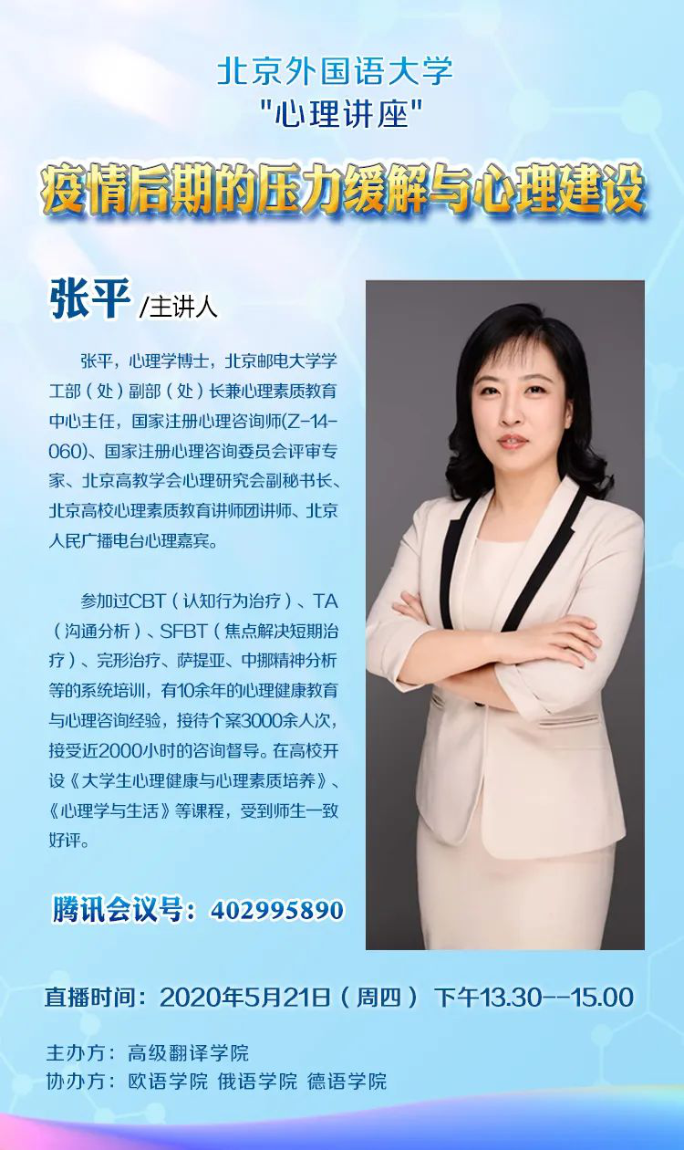2020年5月21日下午13:30,北外YABO鸭脖官网举办了主题为“疫情后期的压力缓解与心理建设”线上讲座。