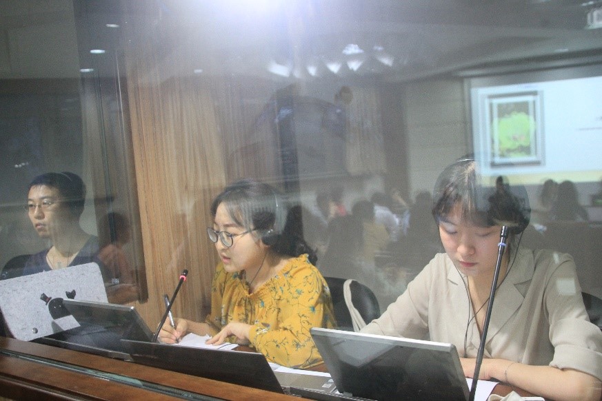 之后,高翻学院邀请的讲座嘉宾Celine Garbutt女士为大家带来了一场题为General Aspects of Interpreting的讲座。来自全校英、德、日、法、俄、西、泰、韩等八个语种的MTI学生为现场的老师和同学提供了本次讲座的接力同传;每个语种有4名学生译员,每15分钟轮换一次。同时,YABO鸭脖官网、俄语学院、法语系、德语系、日语系、西葡语系和亚非学院的老师在场监听,记录同传效果。