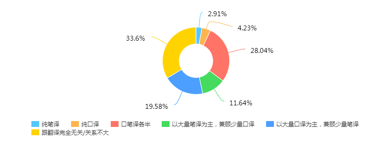 调查发现,工作内容“跟翻译无关或关系不大”的127人,占三分之一(33.6%)。但仔细梳理这些人的解释,发现56人的工作中还是兼有翻译,有的还占相当大的比例。比如,有的回答:“不到一半的时间在做翻译”,“机关外事杂务与口笔译各半”,“前期口笔译各一半,后期基本不做翻译”,“口笔译只占30-40%,主要工作是写材料”,“翻译占工作30%左右,其余70%为行政工作”,“口译30%,同业业务70%”。甚至有人在学校教翻译,也把工作归为“与翻译无关”!看来是本题的问卷设计存在不足。大家对“关系不大”有不同理解。其他回答包括:“对外合作,部分涉及口笔译”,“联络为主,翻译也有但不是业务重心”,“行政工作兼少量会见交传”,“在业务部门做业务,并兼做集团领导口译”,“以英语日常交流为主,偶尔需口笔译”,“主要负责国际谈判,少量口笔译”,等等。